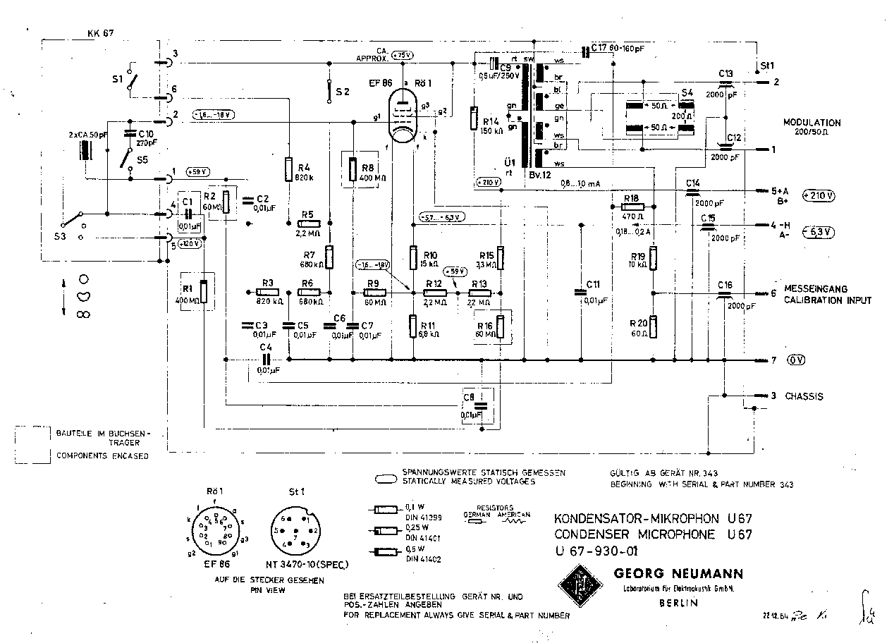 The changing voltage potential on the center electrode of the capsule is picked up and amplified by the EF86 Pentode, which is wired in triode mode - just like the VF14 pentode in the U47. It's input resistance has to be kept VERY high not to disturb the charge/discharge of the capsule, so we use a 1G resistor to bias the grid to 0VDC.